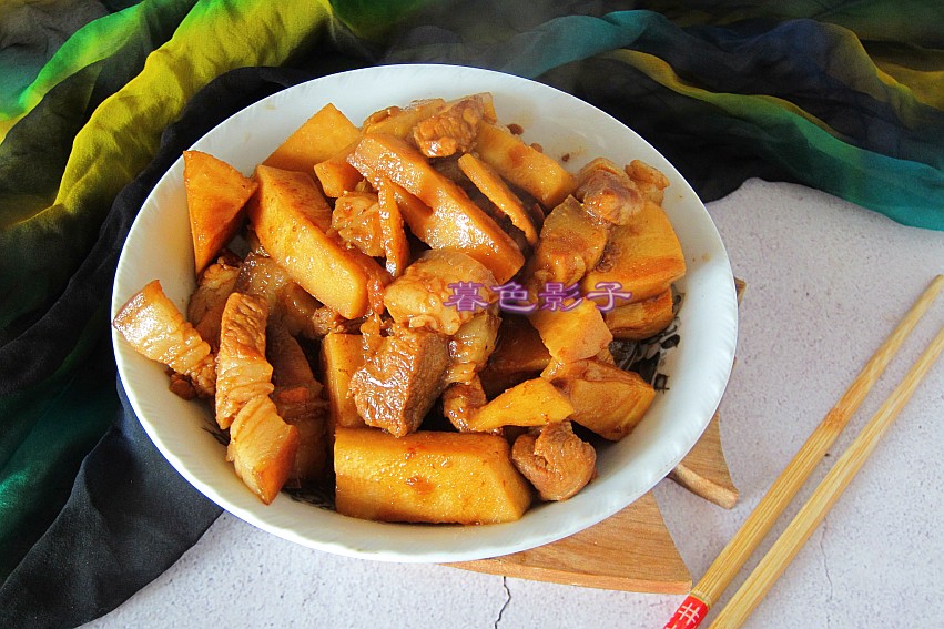 食谱;笋块烧肉。食材;冬笋1个,植物油1勺,猪肉1块,盐1勺,料酒1勺,太太乐鲜贝露调味汁适量,