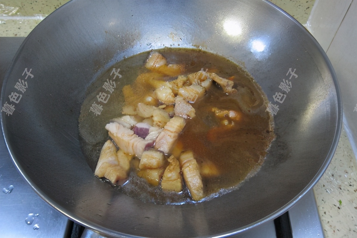 翻炒的猪肉已经变色了,可以加适量的清水,小火炖肉。
