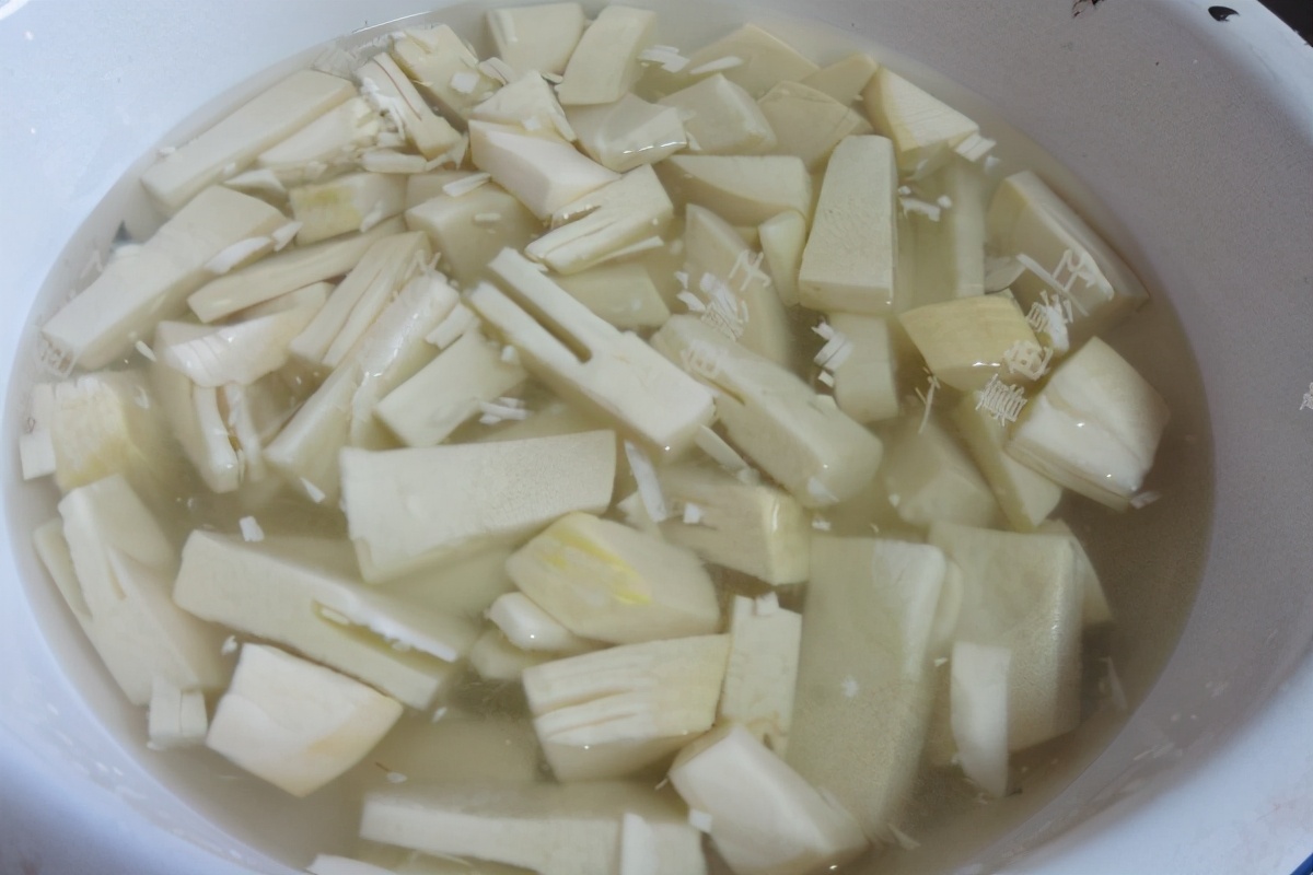 把切好的笋块焯下水,这样做的菜口感更好。吃不完,也可以冷冻起来或者泡酸笋都不错。
