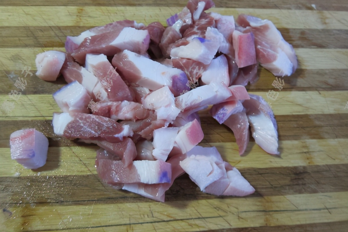 买一块猪的前槽肉,洗干净切成小块即可,现在猪肉真是便宜了,前槽猪肉16元钱500克了。相比之前买一块肉可以剩下青菜的钱了,别笑话我小气,普通人的日子就得算计着过。