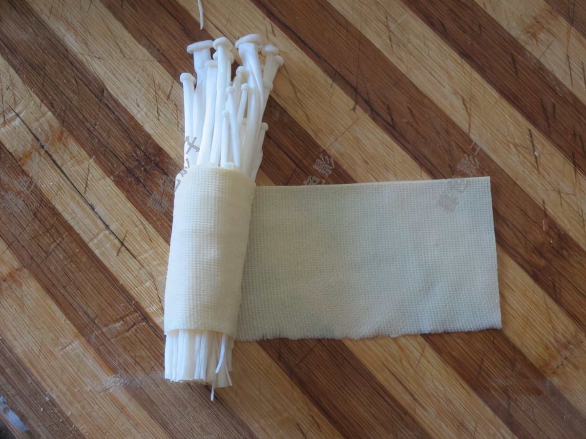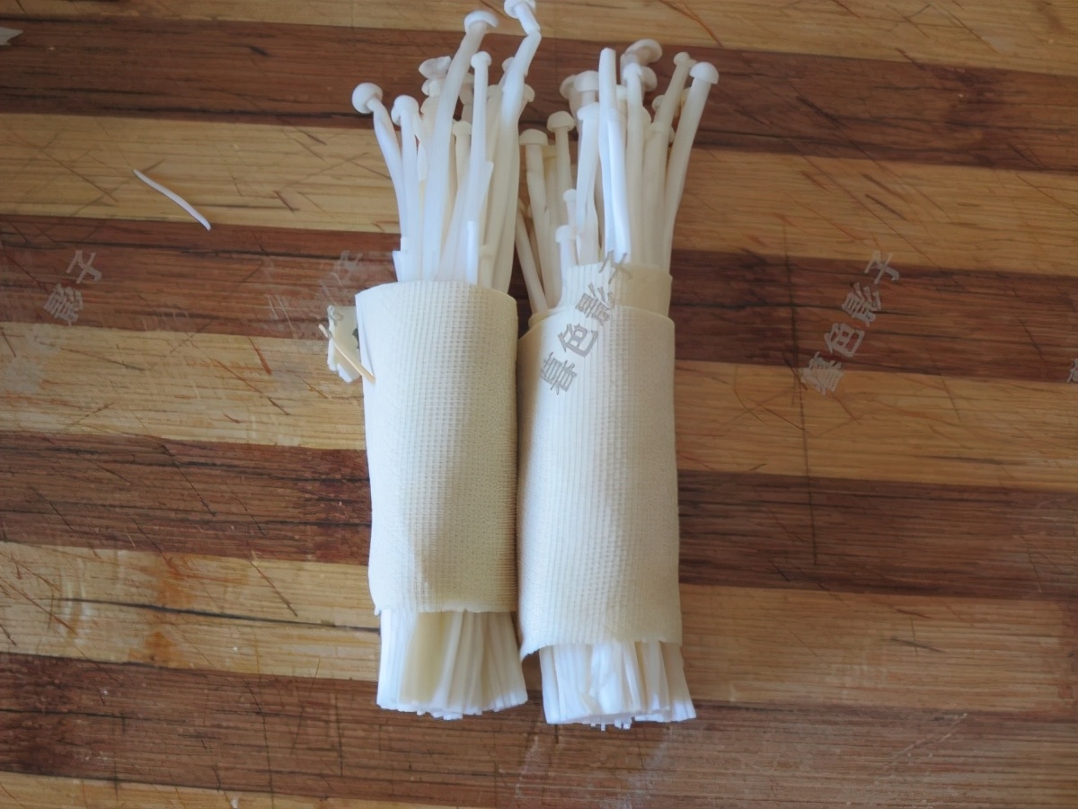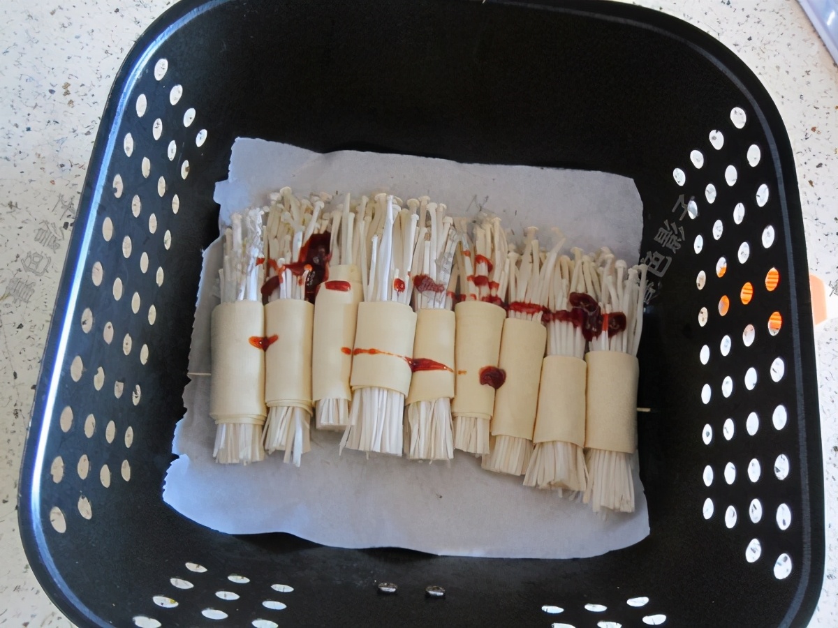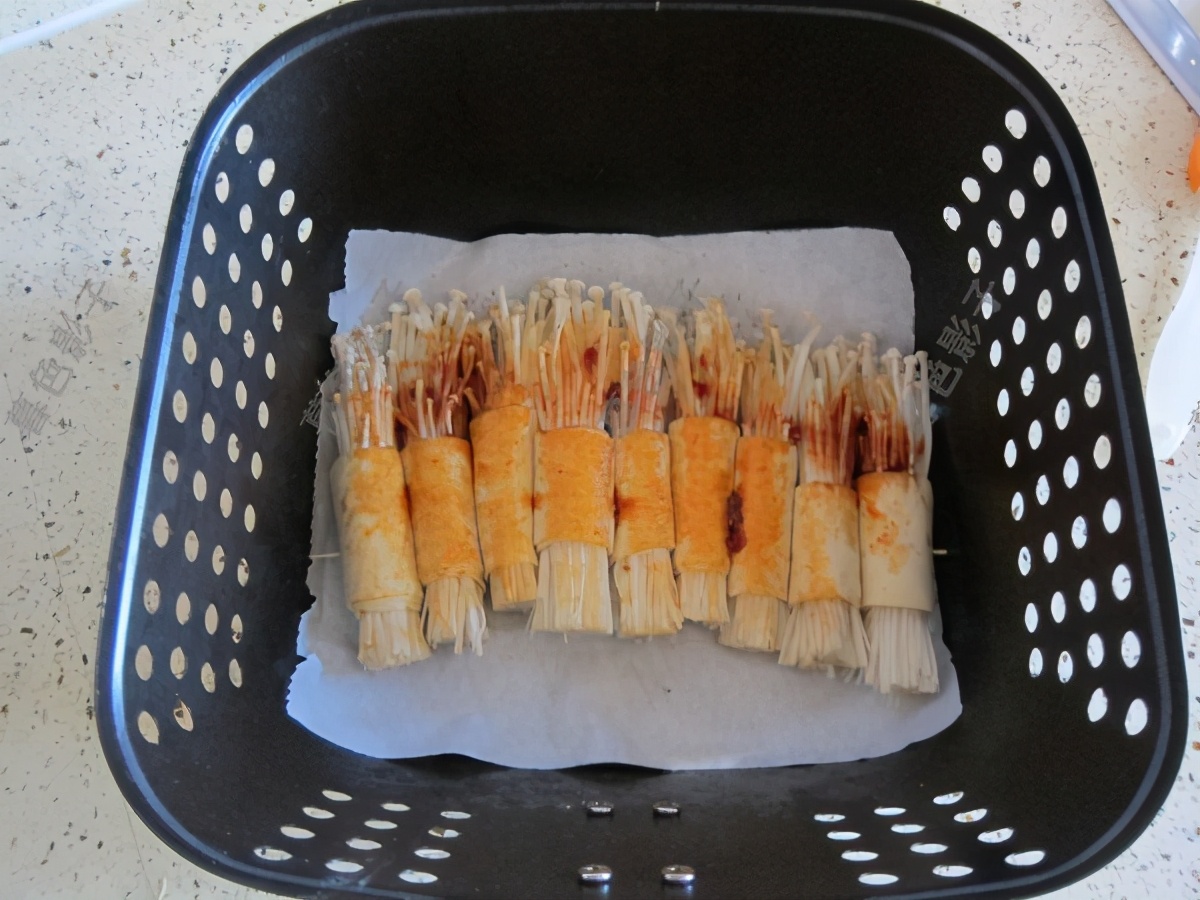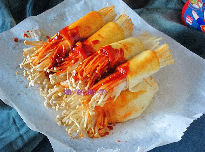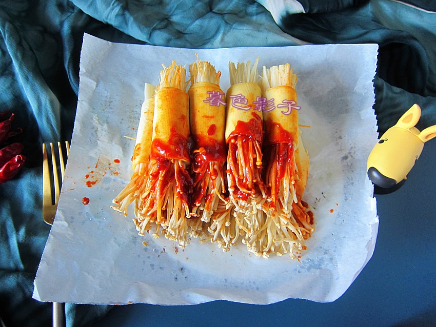 如同图片一样加适量的金针菇,然后卷起来,卷得紧实一点。烤熟了金针菇的水份就蒸发了,不然卷就会散了。