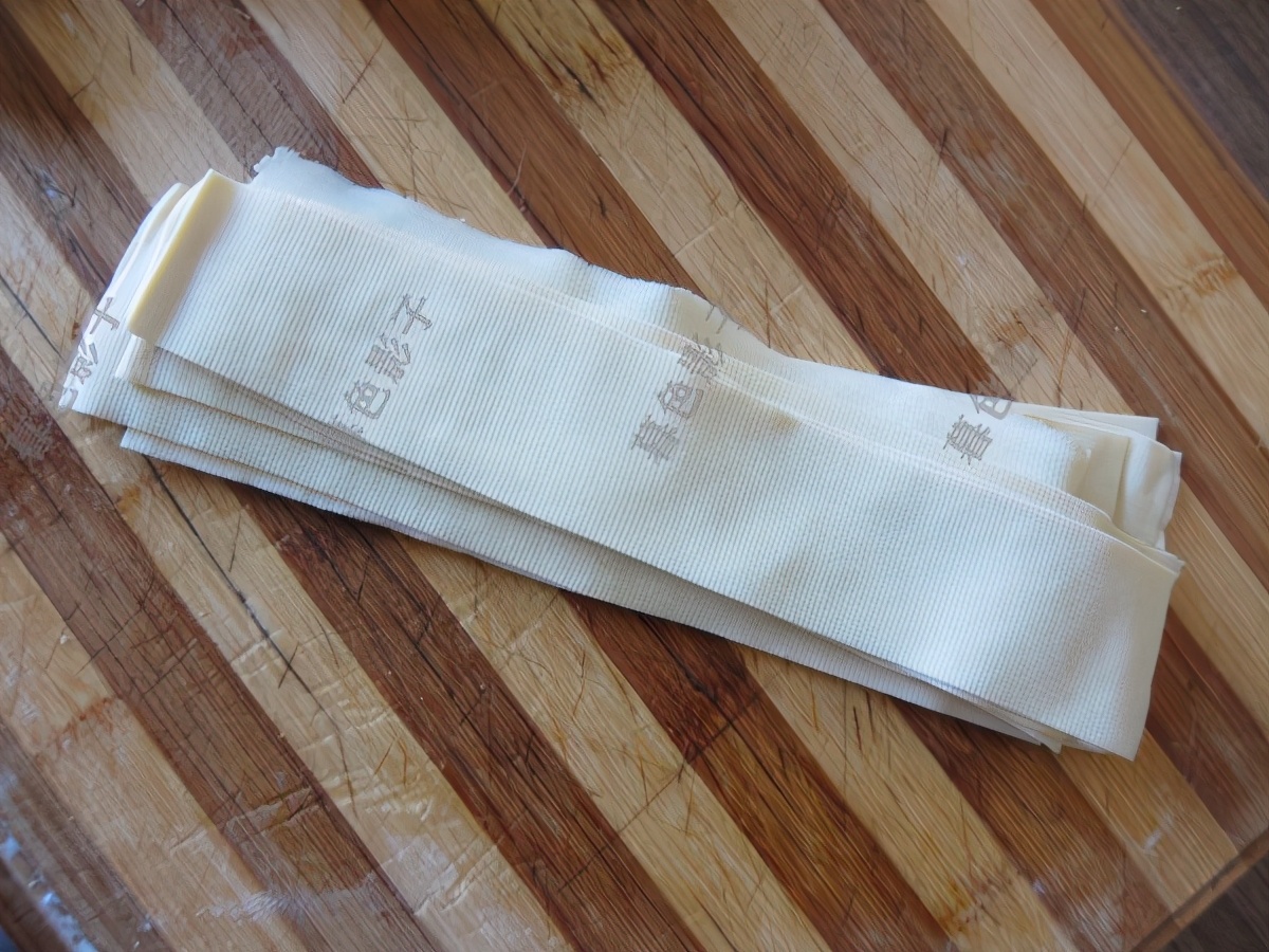制作步骤;北方的干豆腐很薄几乎和春饼一样很透明,。也可以炒菜或者卷青菜蘸酱吃的,这里就是把它切成宽的条。
