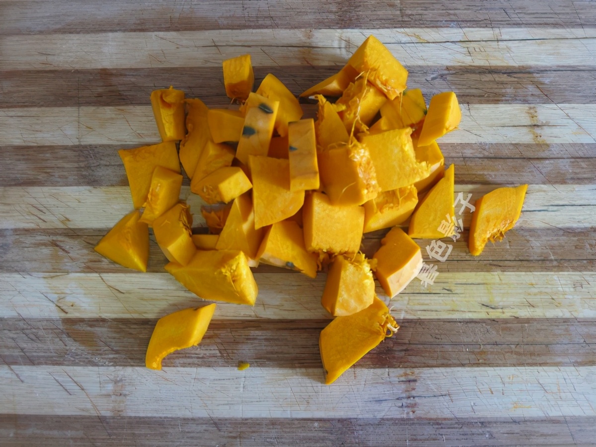 南瓜挖掉内瓤,削皮切块更好吃。