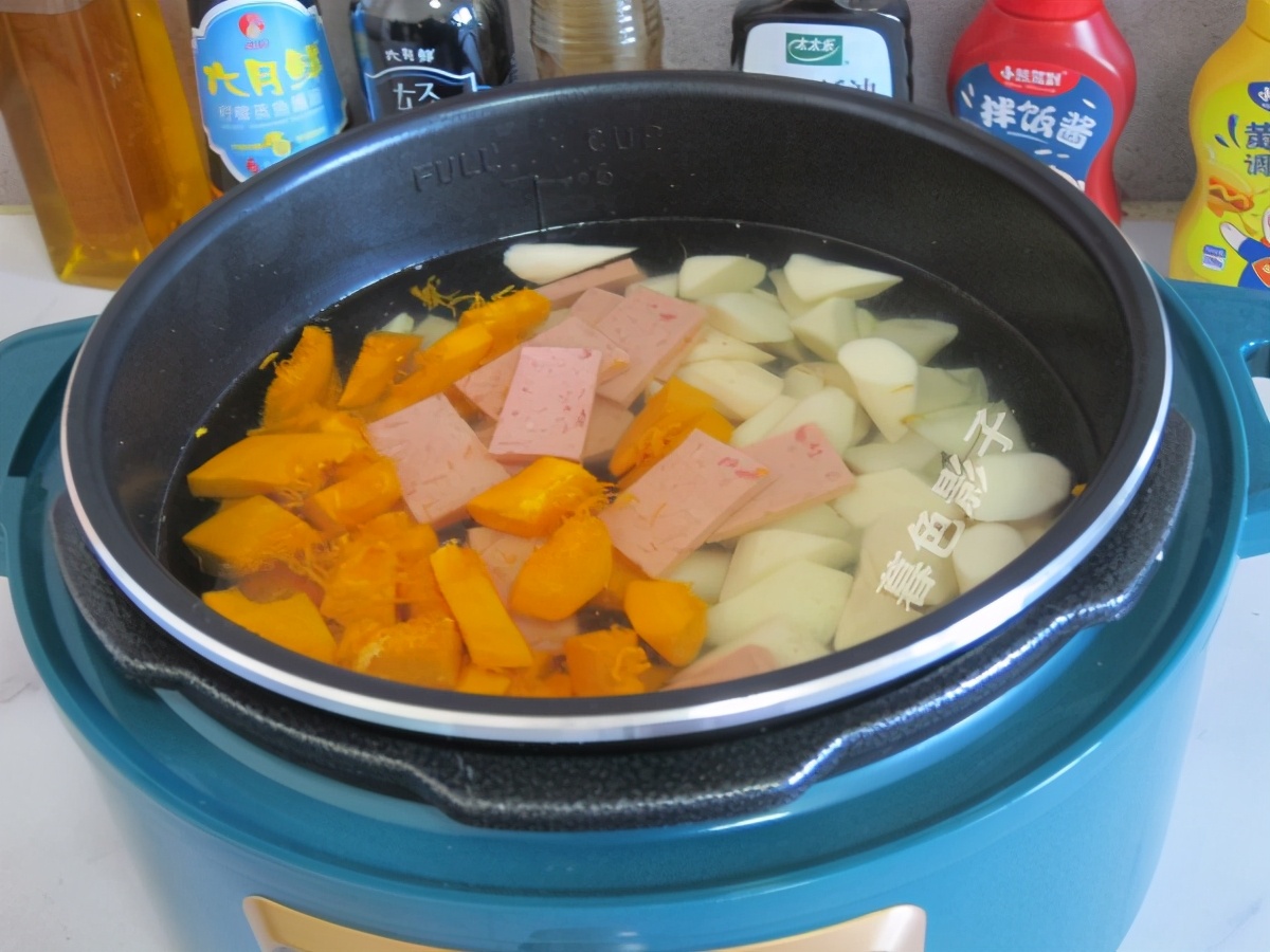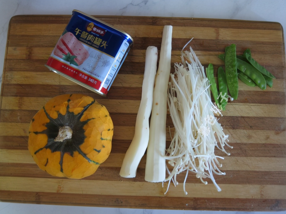食谱;蔬菜番茄火锅。食材;小南瓜1个,山药1个。金针菇适量,午餐肉罐头1个,番茄火锅料包1个。