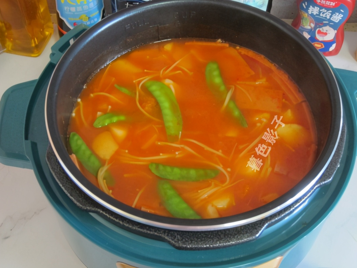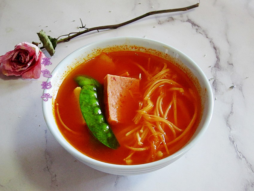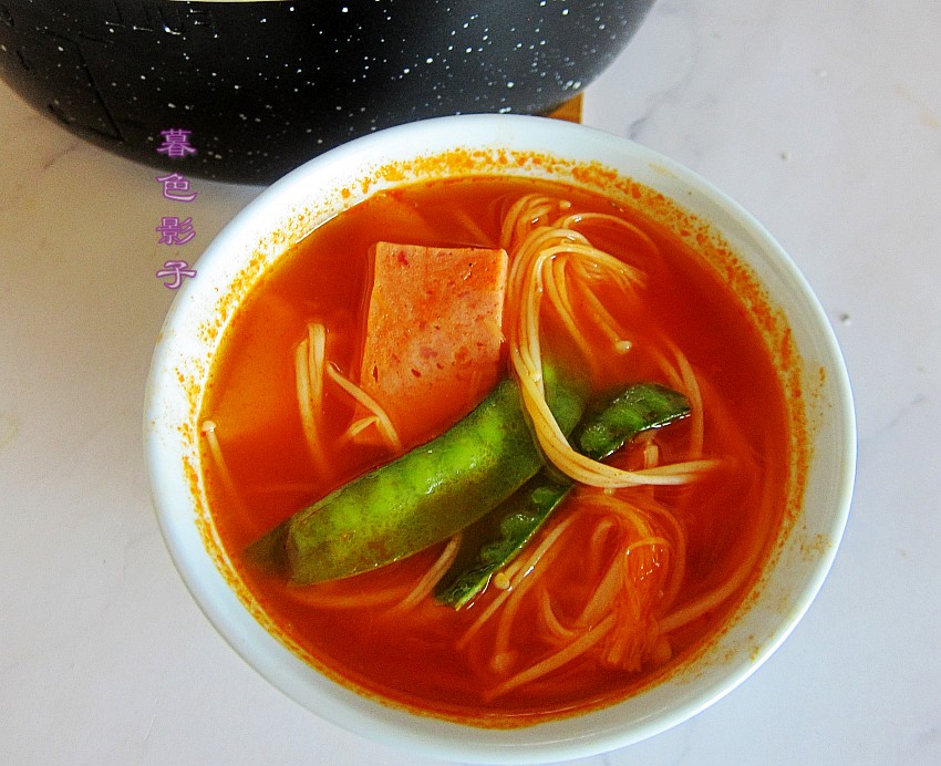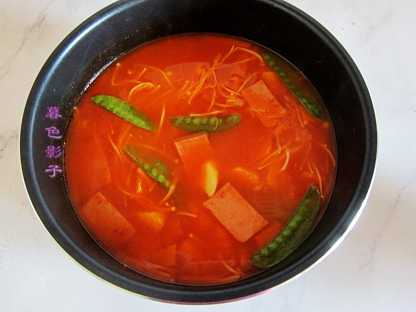 今天就是没有羊肉片。懒得出门买了,直接把午餐肉罐头切片煮了,口感还不错,味道比较清淡的火锅。金针菇,山药,小南瓜都煮上了,幸亏这份的番茄酱火锅料,不是对付的哈。