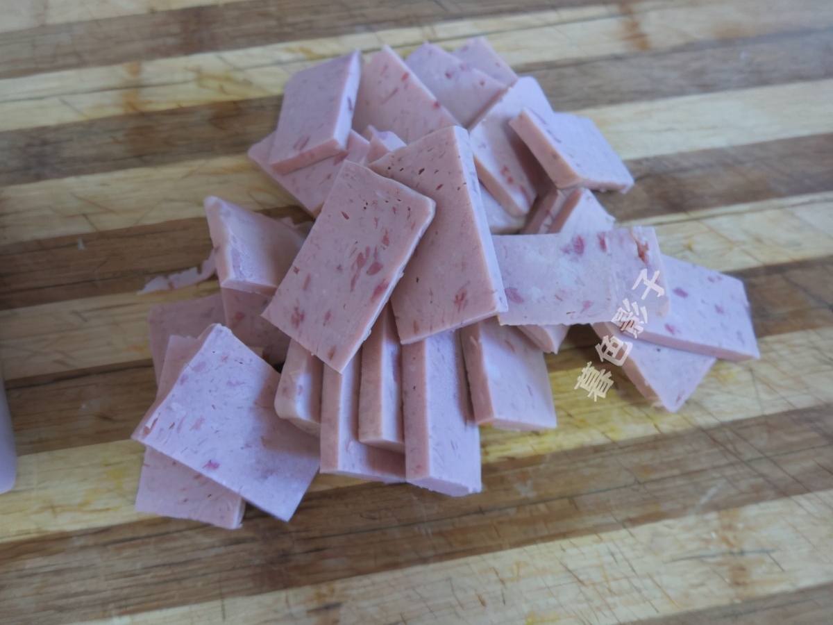午餐肉罐头也切成厚片备用、