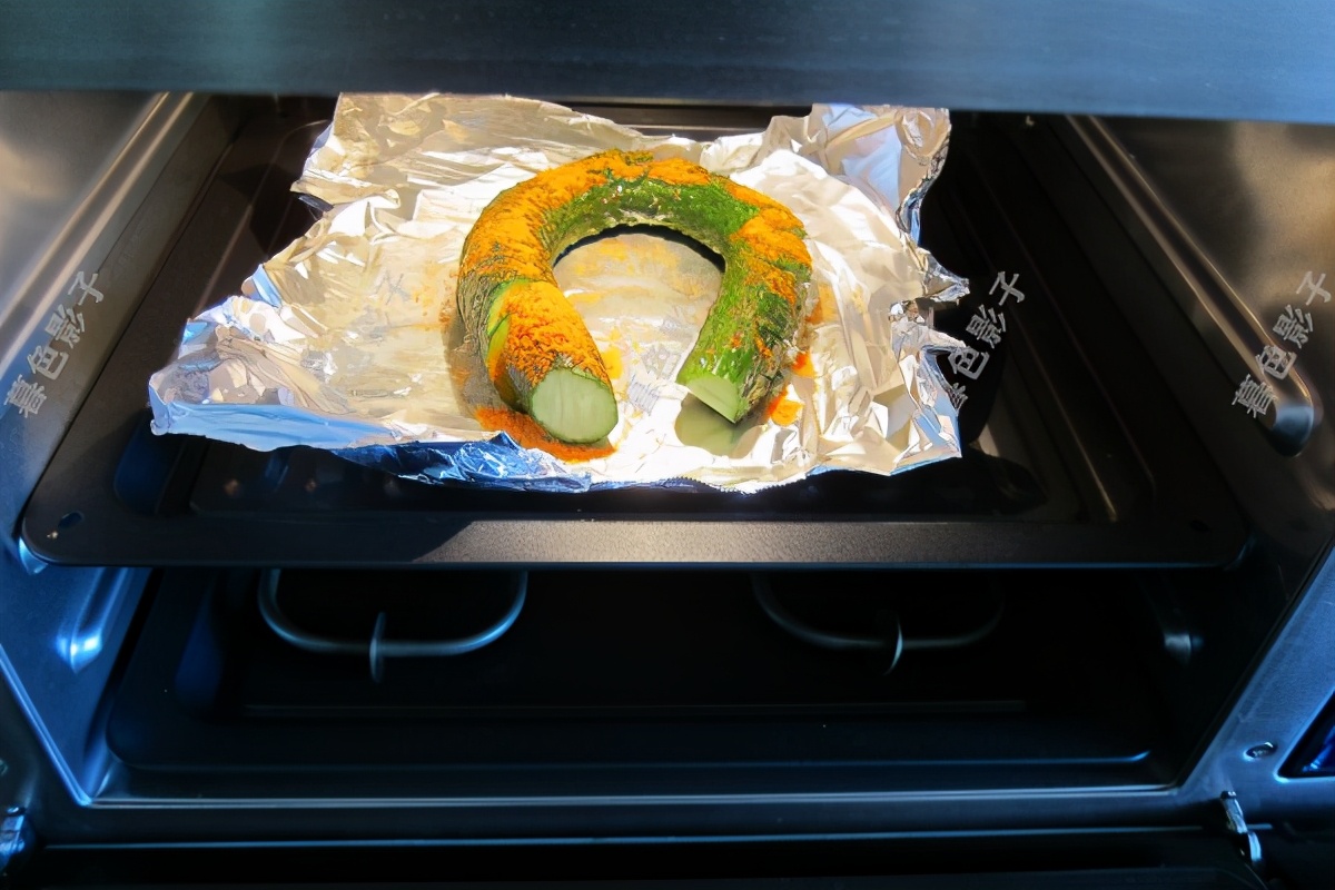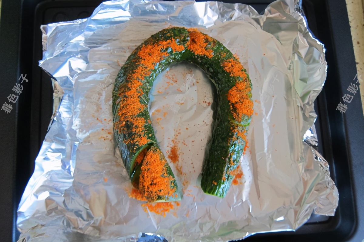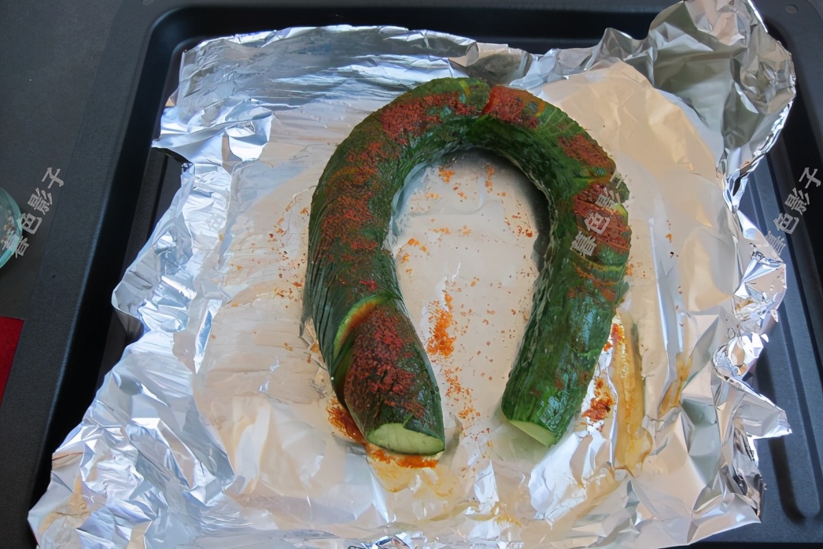 4,烤盘里边铺锡纸,烤的时候黄瓜还会出水的。