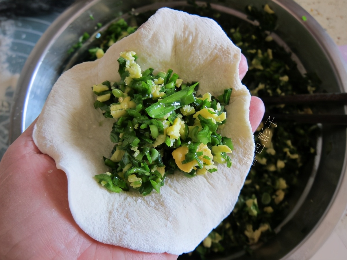 7,擀面皮四边薄中间厚点,这样包饺子皮会很薄,加适量的馅料。