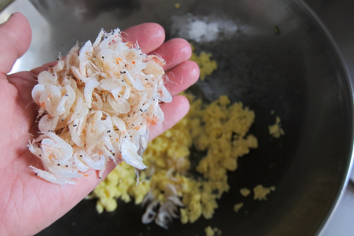 4,植物油热了,直接就下锅炒鸡蛋和虾皮,炒的鸡蛋碎点更好包饺子。