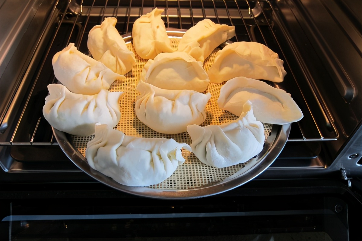 8,包好的蒸饺放在铺屉布的笼屉上边,蒸箱加水到水位线,再把饺子放进蒸箱内。