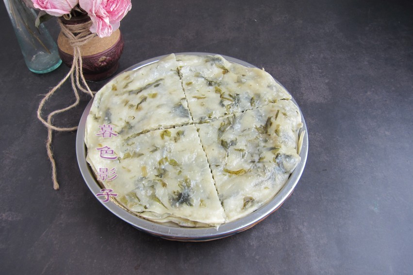 食谱;千层腌菜饼。食材;面粉3杯,雪里蕻腌菜1碗,植物油适量
