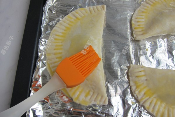 4,在饼皮上边刷上鸡蛋液,烤盘铺锡纸或者油纸都可以的。