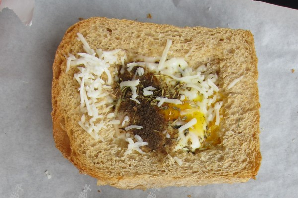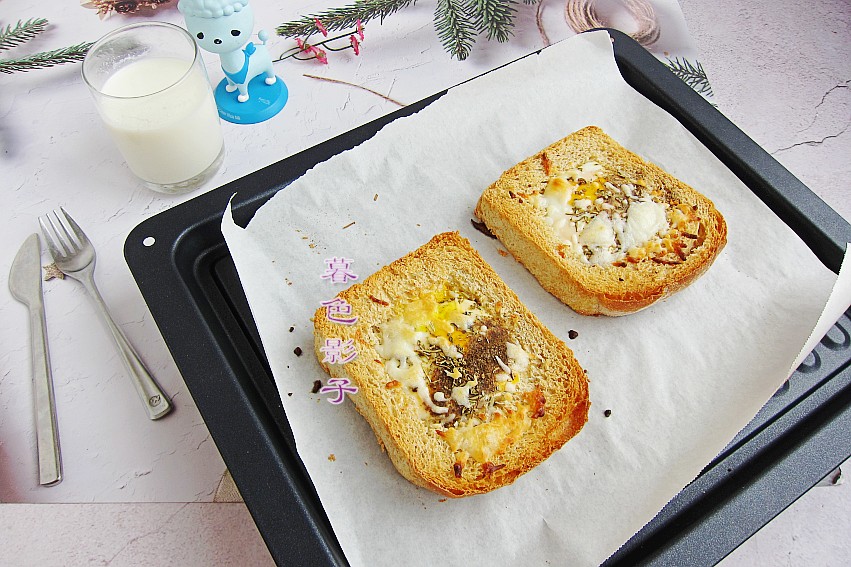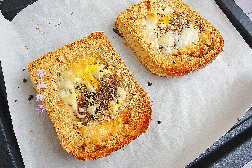 食材;吐司2片,鸡蛋2个,披萨草适量,胡椒粉适量,芝士碎适量。