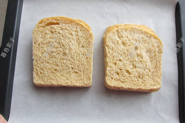 5,进烤箱之前把搭配好的吐司片,放到铺上油纸的烤盘中,烤盘放在烤箱的中层。