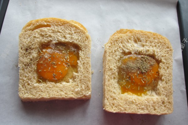4,撒适量的披萨草和黑胡椒粉,在鸡蛋的上边。