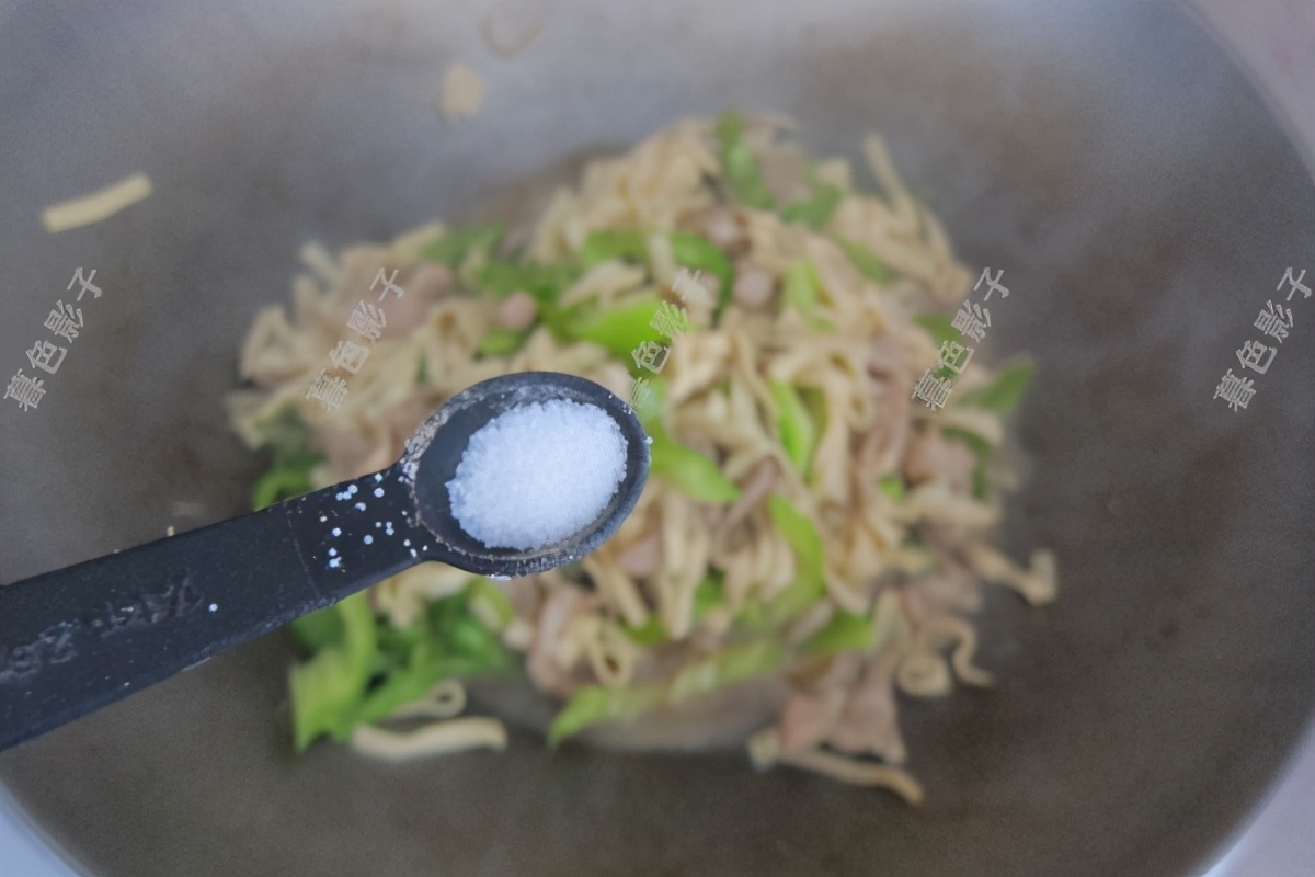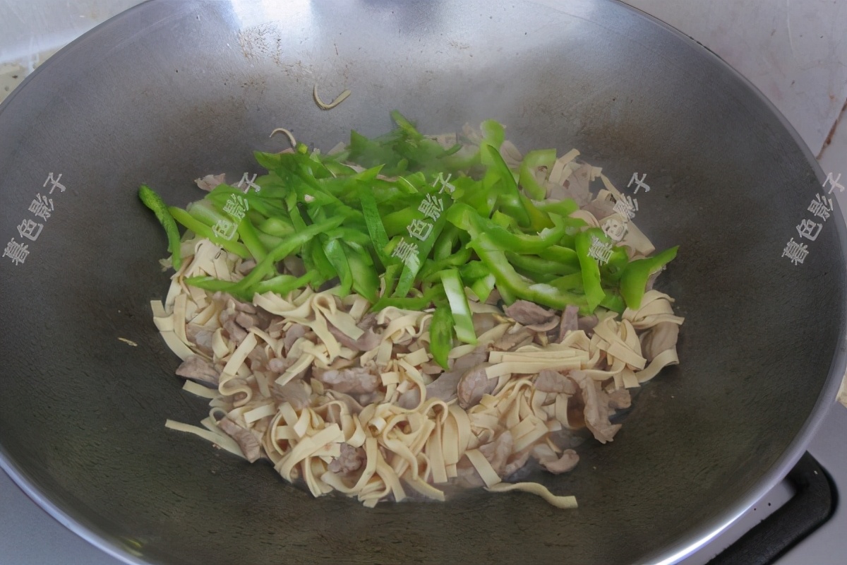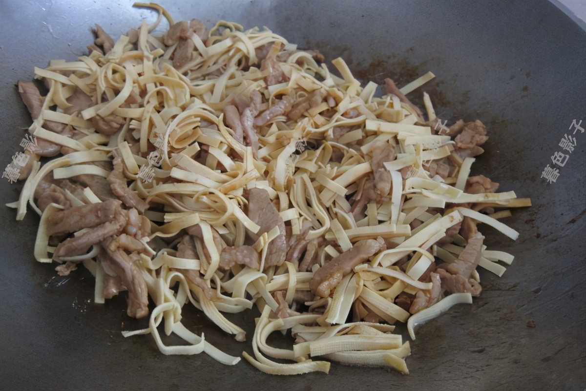 6干豆腐本身熟的不用炒得太久,混合下就行,小辣椒下锅翻炒变色即可。