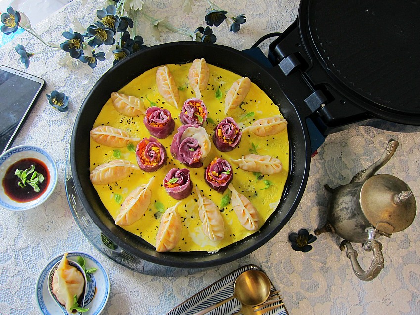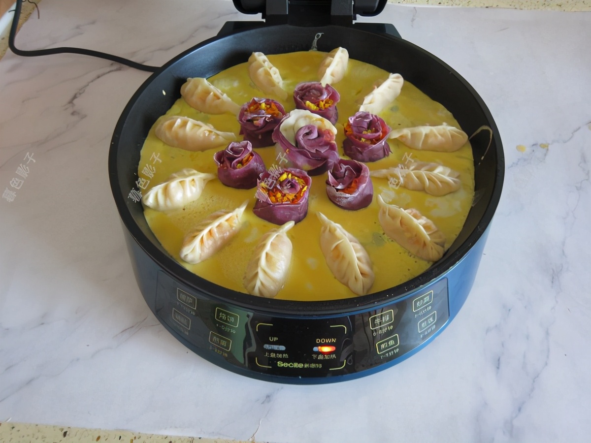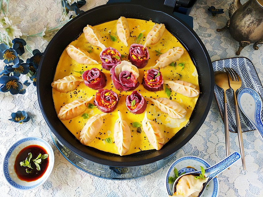 盖锅煎5分钟左右饺子就熟了,馅料鸡蛋是熟的,胡萝卜生的也能够吃,所以只要面皮熟了即可,撒上鸡蛋液,用电锅的余温们2分钟鸡蛋液就熟了。