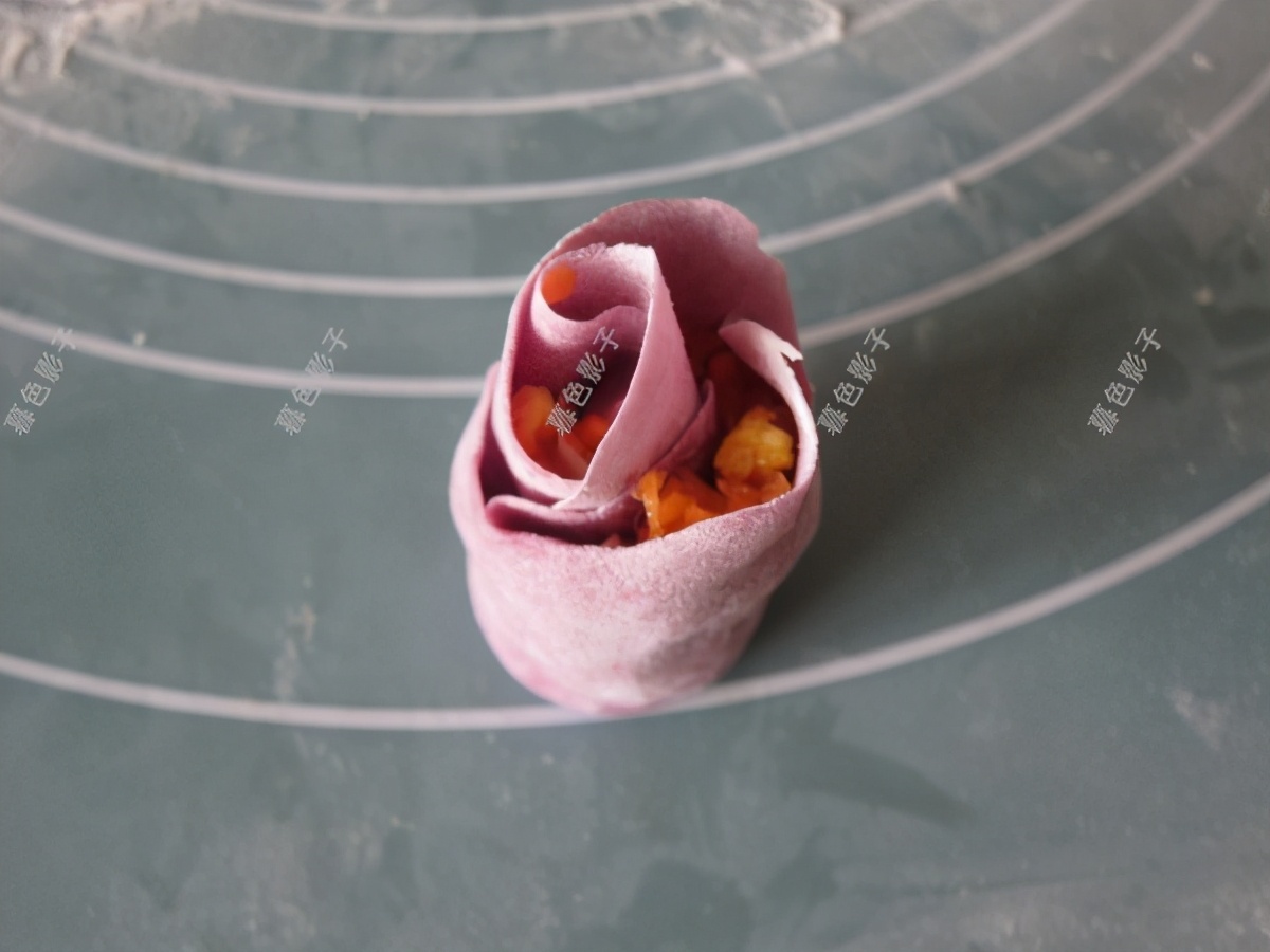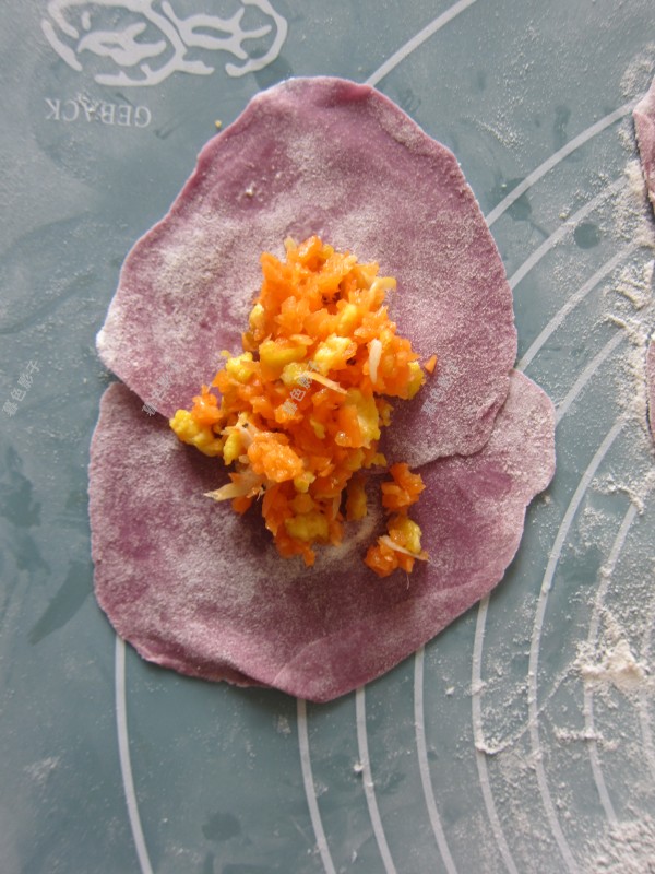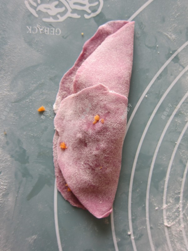 松弛好的紫薯面团,分成小面团,擀成面皮,做玫瑰花饺子,2个面皮如图,加适量的馅料