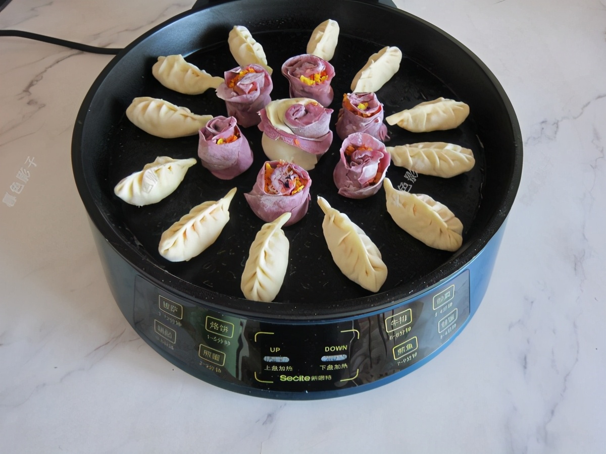 做好的饺子全部摆放在加植物油的电饼铛锅内,把锅盖上准备煎饺子。
