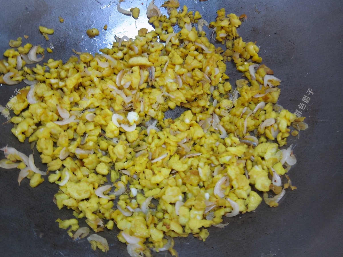 5个鸡蛋全部打散,留出一半。剩余的用植物油炒鸡蛋,加1把虾皮。