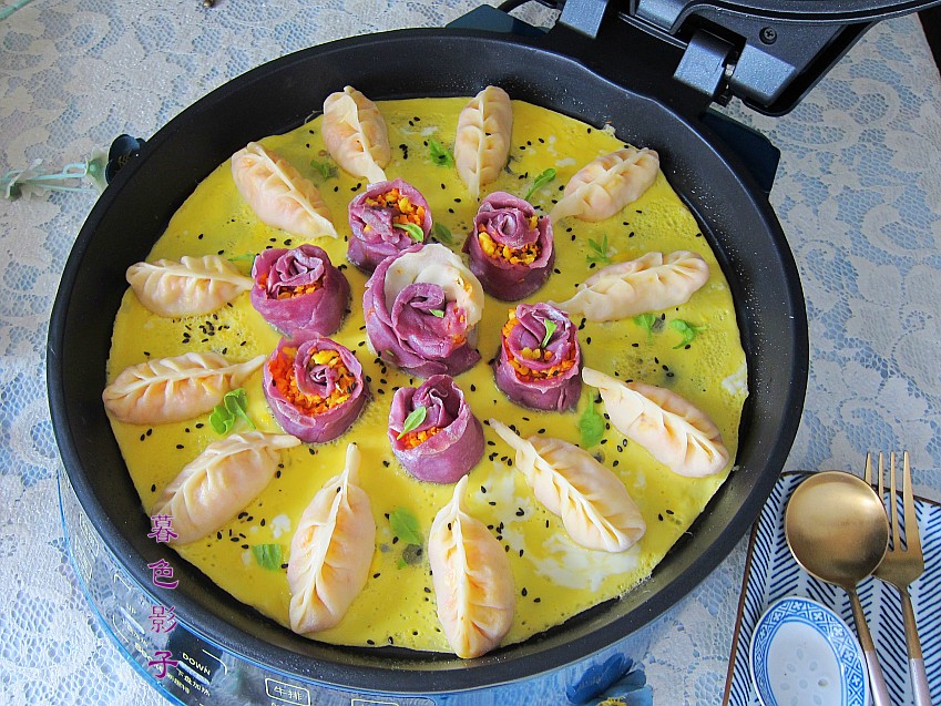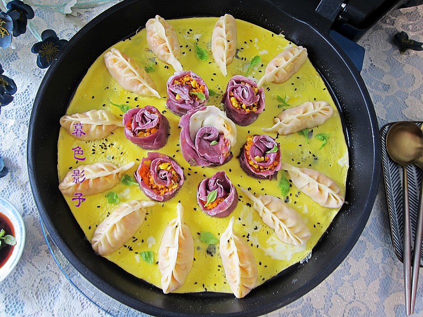 食谱:玫瑰抱蛋蒸饺。食材;面粉3杯,紫薯粉30克,胡萝卜1个,鸡蛋5个,植物油适量,虾皮1把。