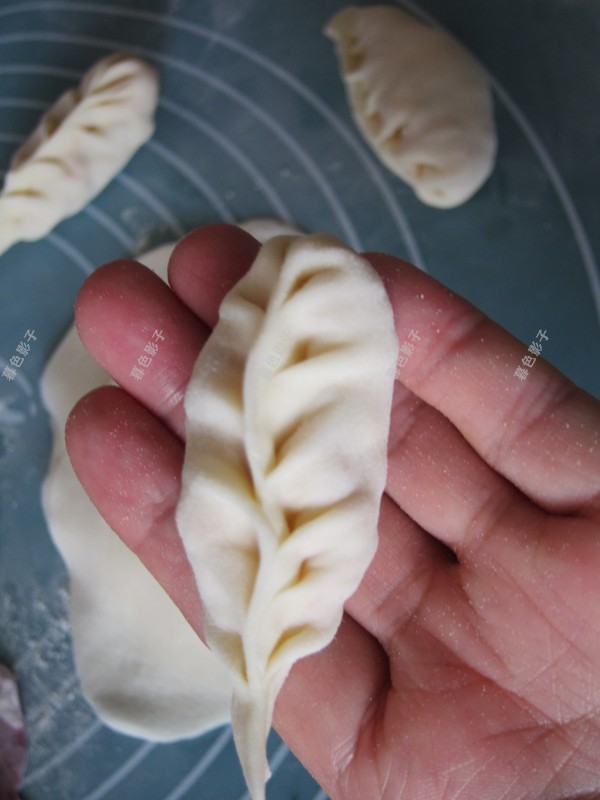 再来做树叶饺子,如同图片一样先折叠一下,再捏起来。