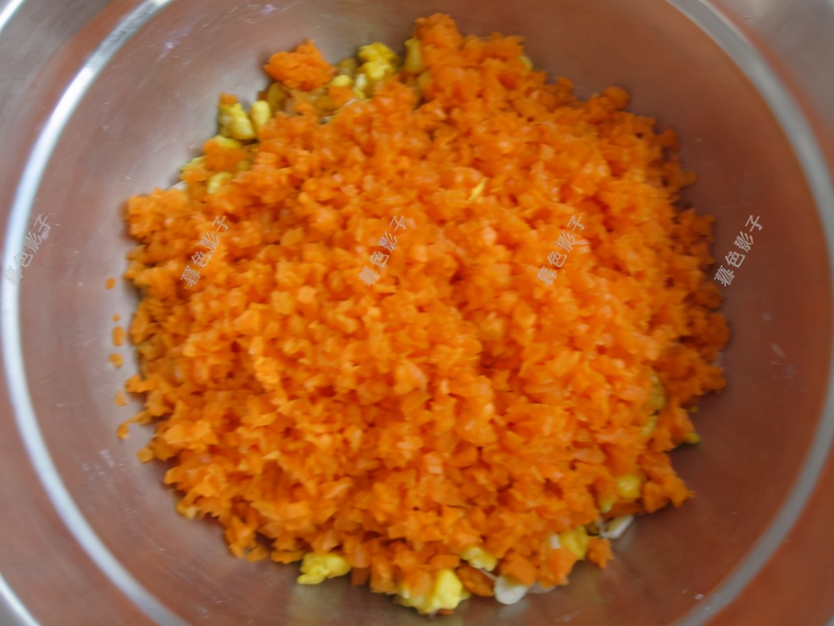 胡萝卜削皮,然后切碎和炒好的鸡蛋混合,加植物油,不需要加盐,虾皮是咸的。