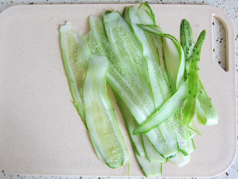黄瓜用刮刀削成长片,然后在卷起来就OK了。