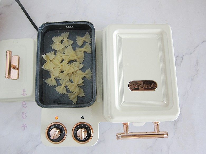 制作;再早餐机左边的煮锅加冷水不要超过水位限制,意粉冷水下锅煮10分钟。按意大利粉袋子上标识时间煮即可,(每一种意粉的时间都不同,更具体的看说明操作)。
