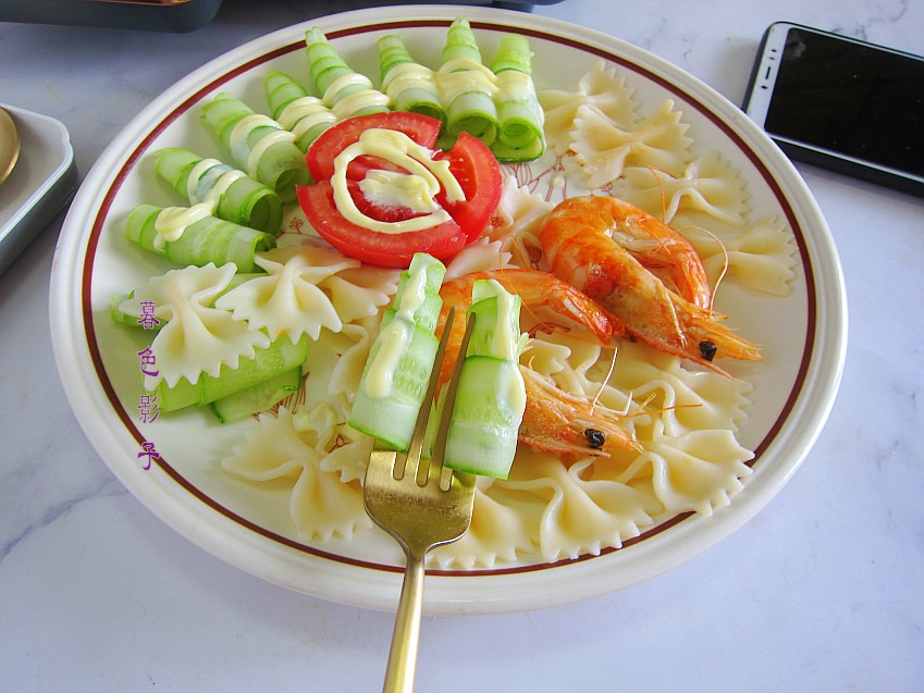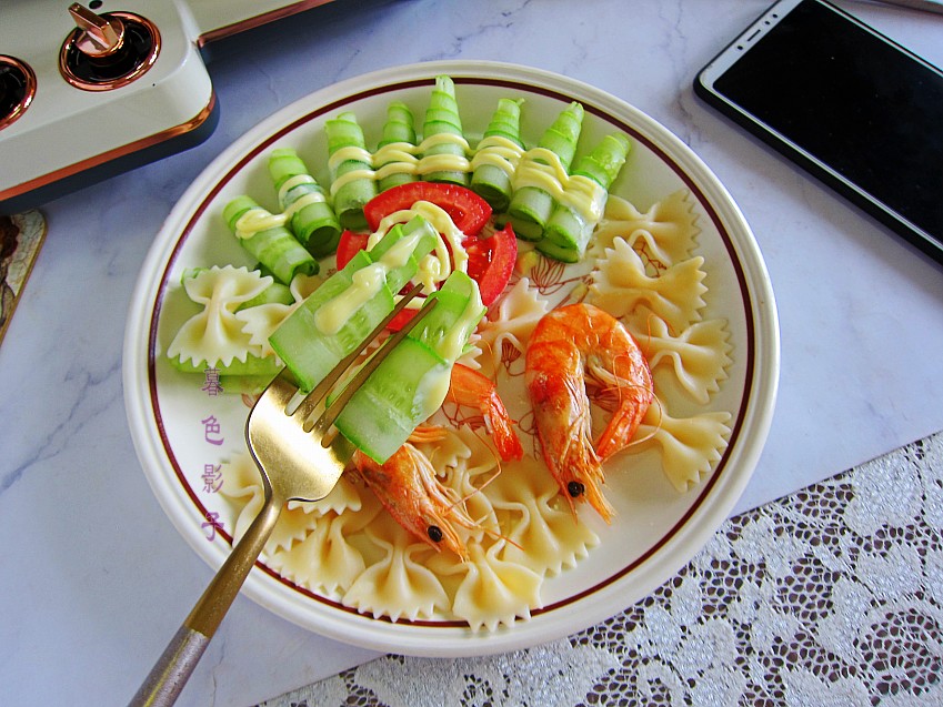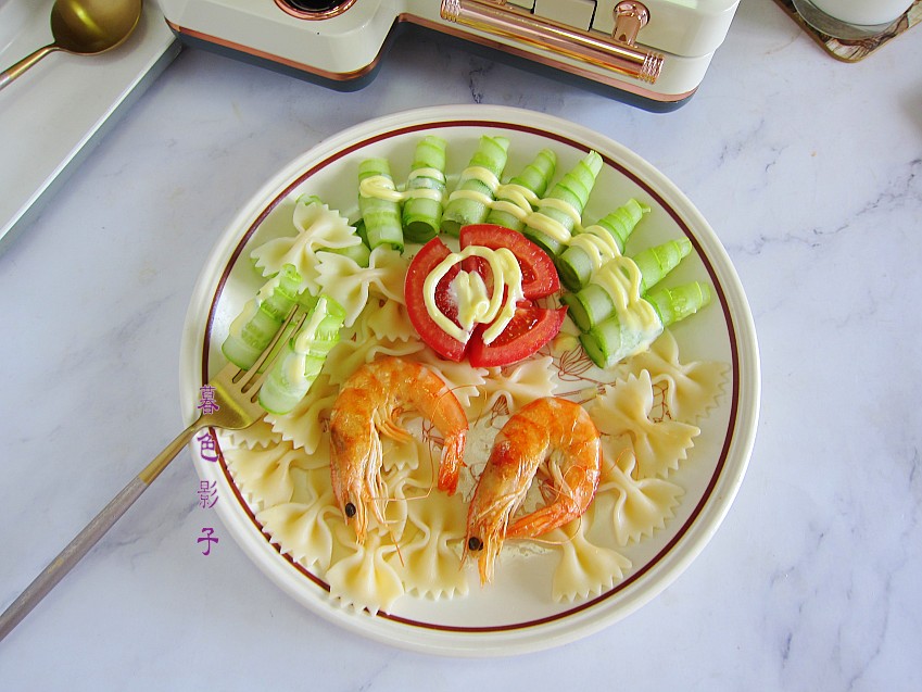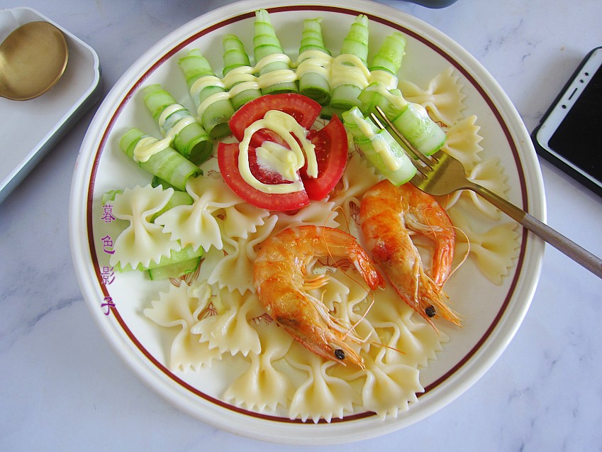 食谱;沙拉拌意粉。食材;花式意粉一把,黄瓜1个,西红柿适量,大虾2个,沙拉酱适量。