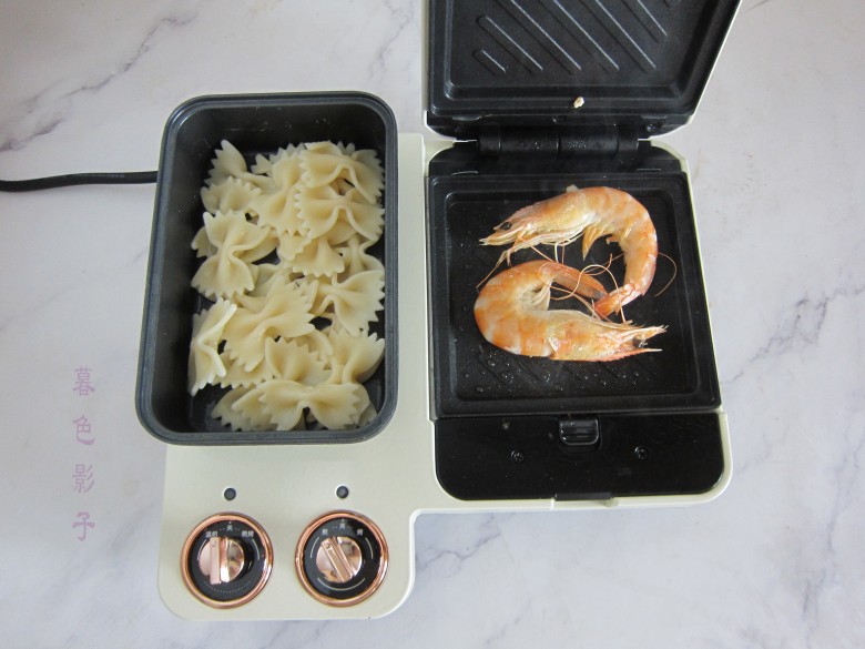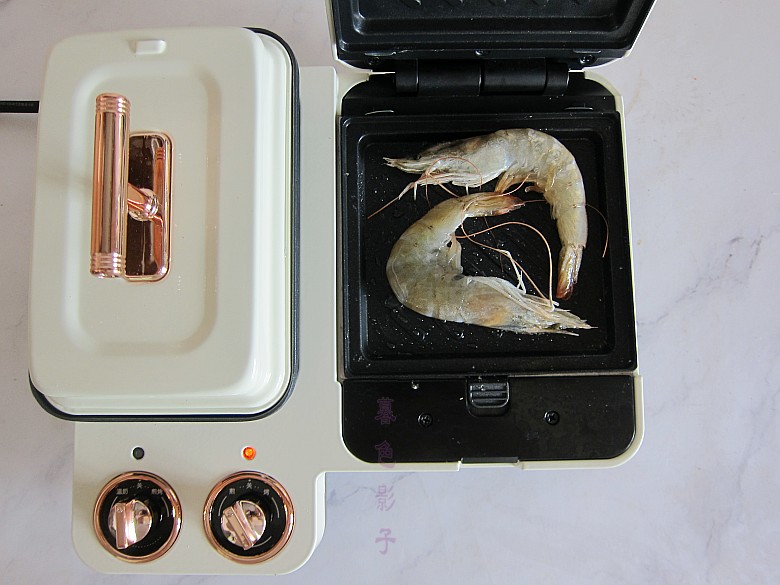 盖上早餐机的盖子煮,温度上来了,自动停止加热。然后再把右边的煎盘刷点植物油煎大虾。