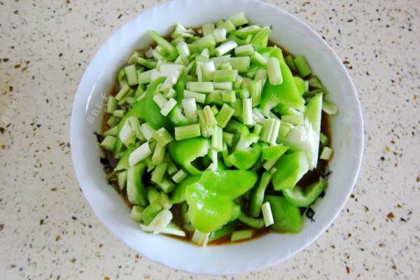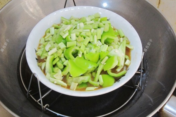将切好的辣椒和青蒜都放进碗中。