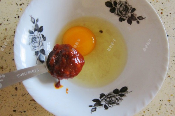 加适量的豆瓣酱放在鸡蛋的碗里,打散鸡蛋混合融合。