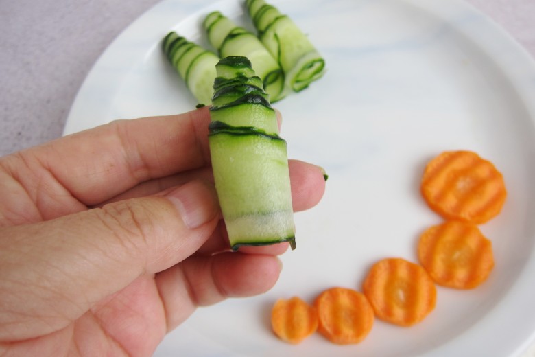 把刨的黄瓜片,从一端卷起来成为筒状摆盘。