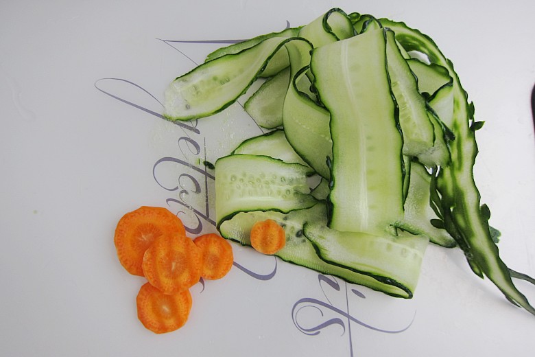 生吃的蔬菜记得洗干净哈,黄瓜用刷子刷洗,胡萝卜要刮掉外皮,然后切成小片。黄瓜用刨刀刨成薄片备用。