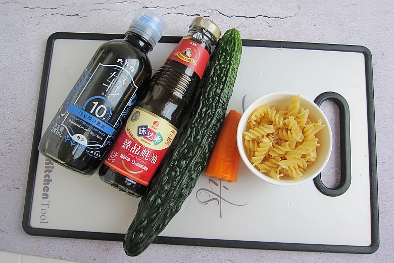 食谱;早餐蔬菜拌意粉 食材;意大利粉适量,黄瓜,胡萝卜适量,六月鲜酱油1勺,蚝油1勺,咸蛋半个。