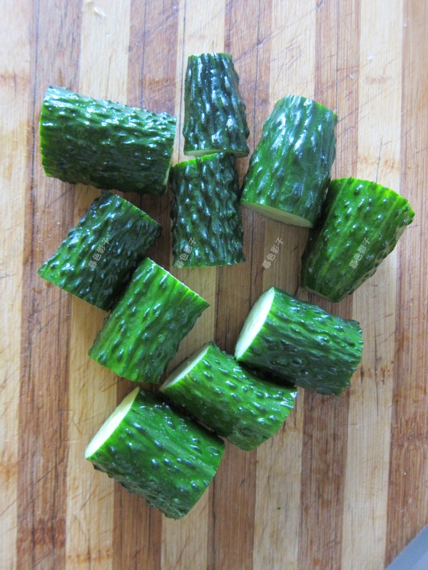 把黄瓜段改刀,切成条状备用,也可以按照自己的习惯制作。