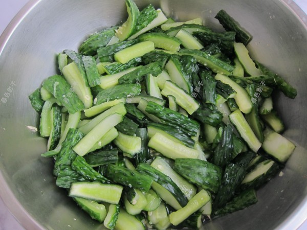切好的黄瓜放进容器,加盐加盐混合均匀,腌制8小时左右,如果放得盐多腌制的时间会缩短。