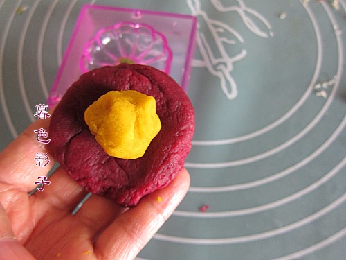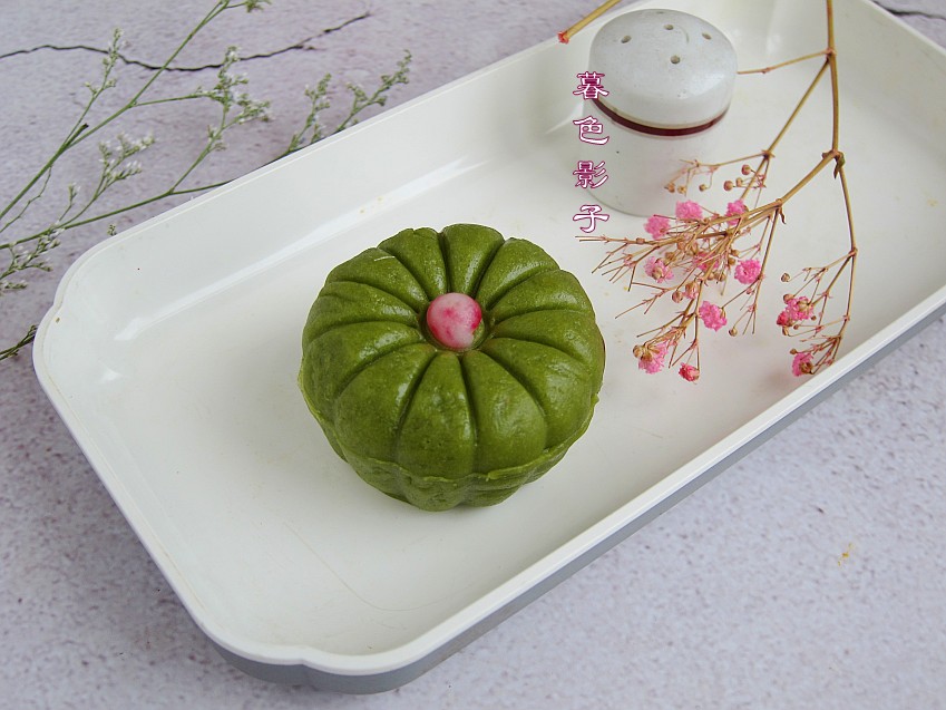 7包上馅料之后就用手向上推面皮,最后再合拢就行了,装进模具按压出花纹就完成了。