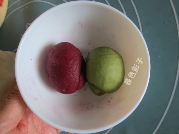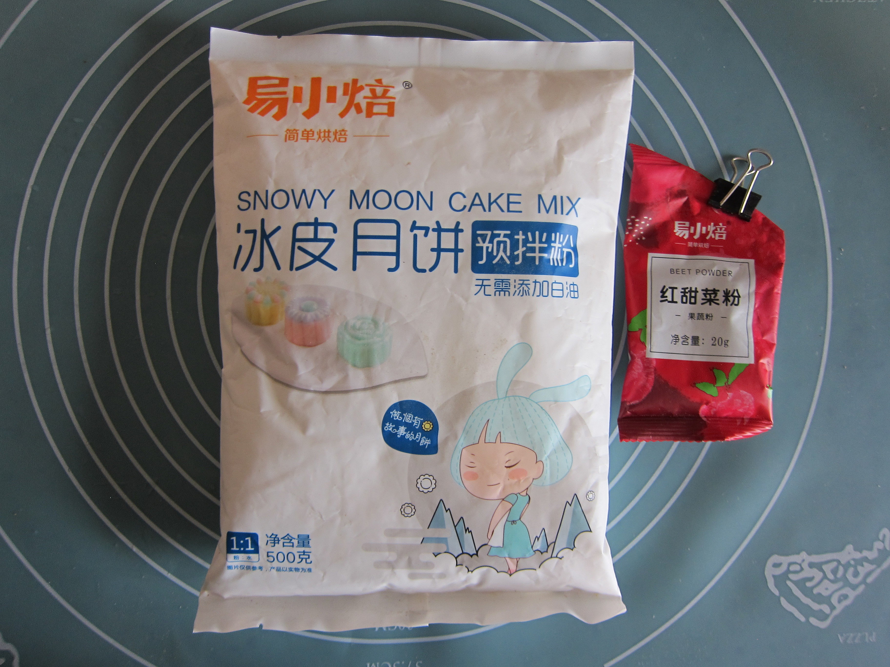 食材;易小焙冰皮粉200克,糖50克,植物油适量,熟南瓜泥适量,热水200毫升,红菜根粉,大麦苗粉适量。