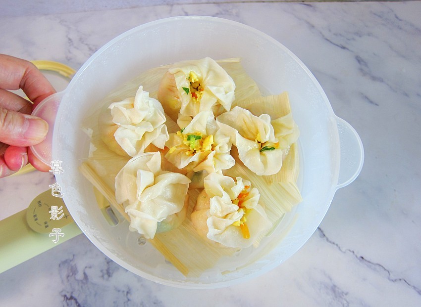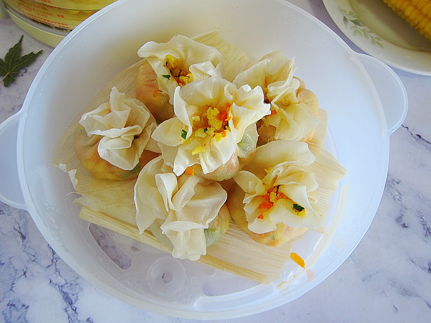 放入铺上玉米叶的笼屉里边,如果你没有可以忽略了。下锅蒸饺只需要在烧开的锅内蒸5分钟即可。