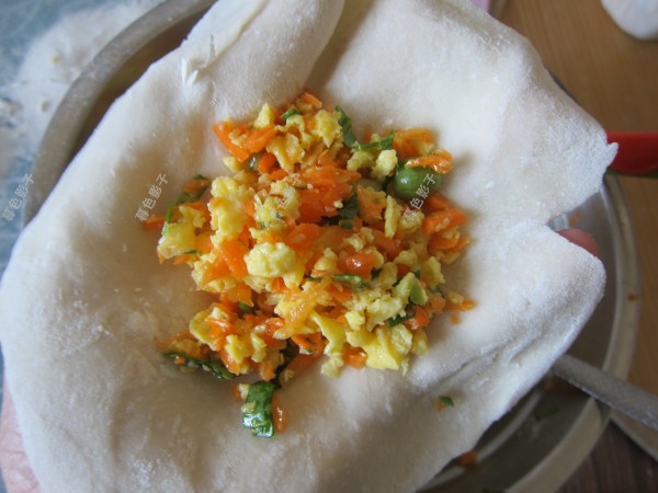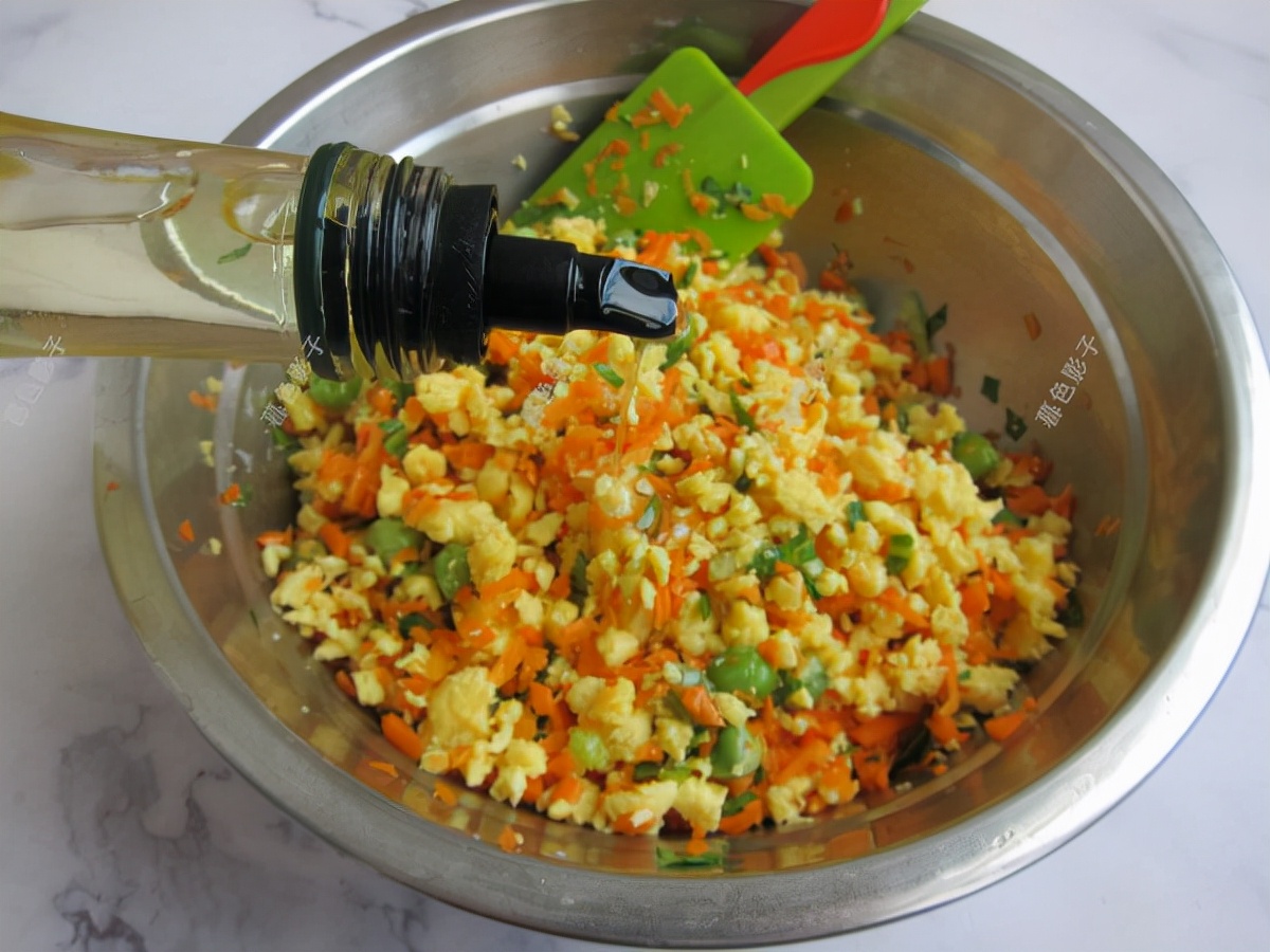2,鸡蛋用植物油炒熟,炒得碎一些包馅就更省事,胡萝卜和香葱都切碎加植物油拌在一起。