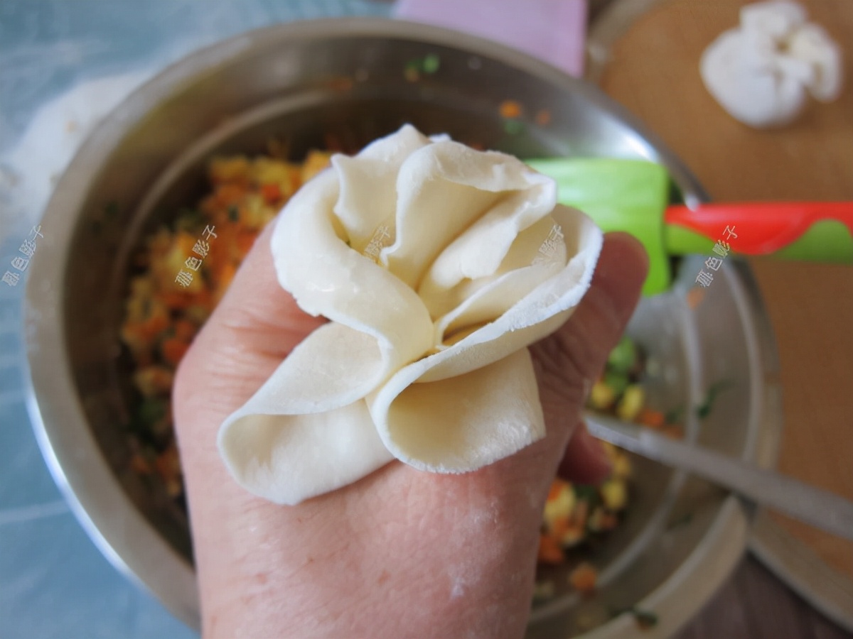 1、热水烫面揉成面团再松弛半小时左右,分成小面团加干面粉擀成面皮,在面皮上放适量的馅料,然后手掌合拢捏紧即可,因为蒸饺只需要在烧开的锅内蒸5分钟即可。