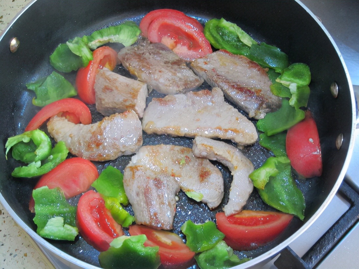 锅里的里脊肉要煎得双面都变色,再把配菜都放入锅内,改为小火。