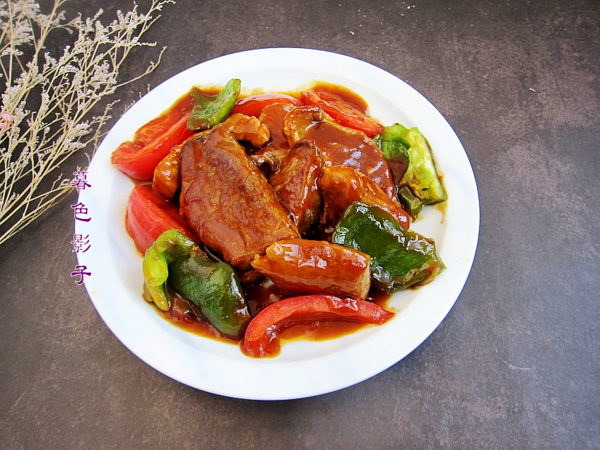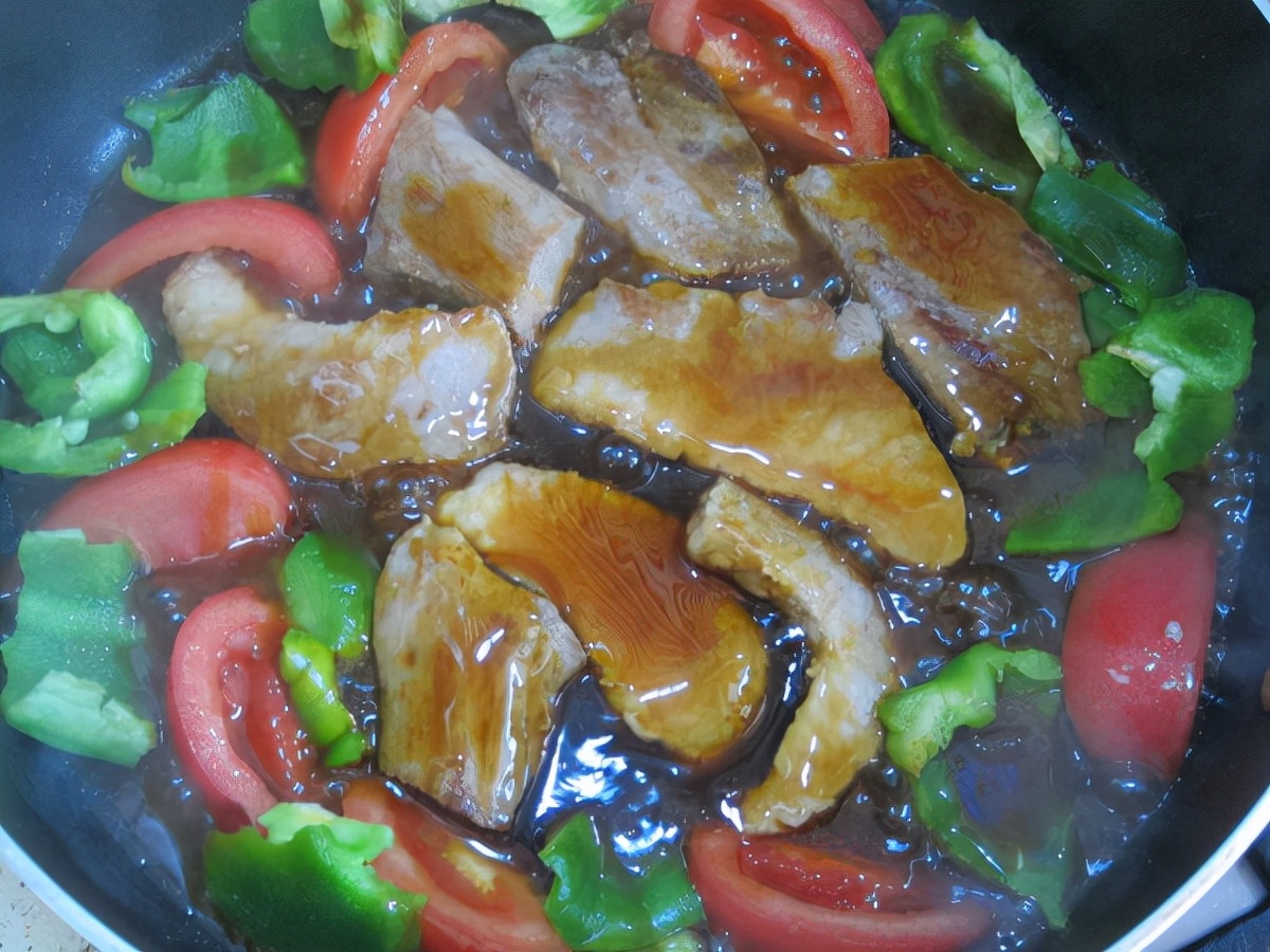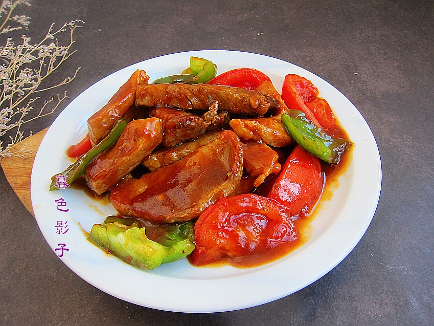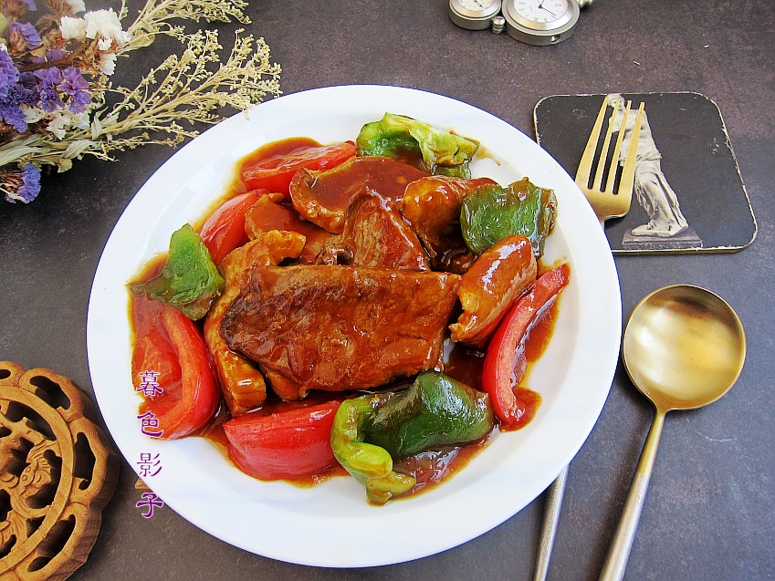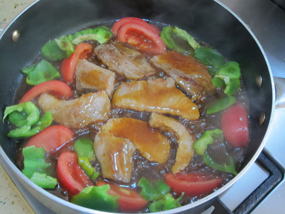 配菜是西红柿和辣椒,不用过度的煎制,酱汁烧起小泡泡肉已入味,即可关火出锅。