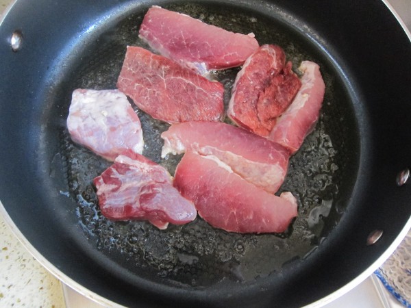 平底锅内加植物油,将肉片放入锅内大火煎肉。