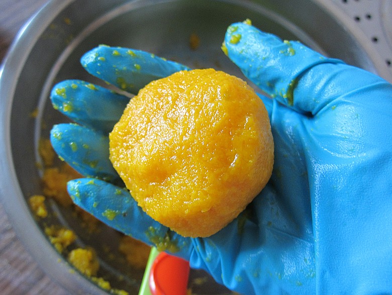 用按压铲压成南瓜泥,也可以用料理机,但是那样做要加点水,打成泥会稀了不成型,还得炒一下个人感觉直接按压成泥会简单一些。