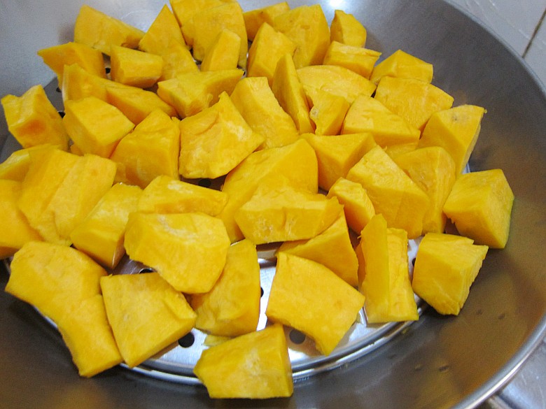 南瓜削皮(南瓜泥口感好),然后切成小块,这样蒸节约能源,熟得快,做南瓜泥的时候也减轻劳动力。将切好的南瓜块放在笼屉上需要大火蒸15分钟左右。