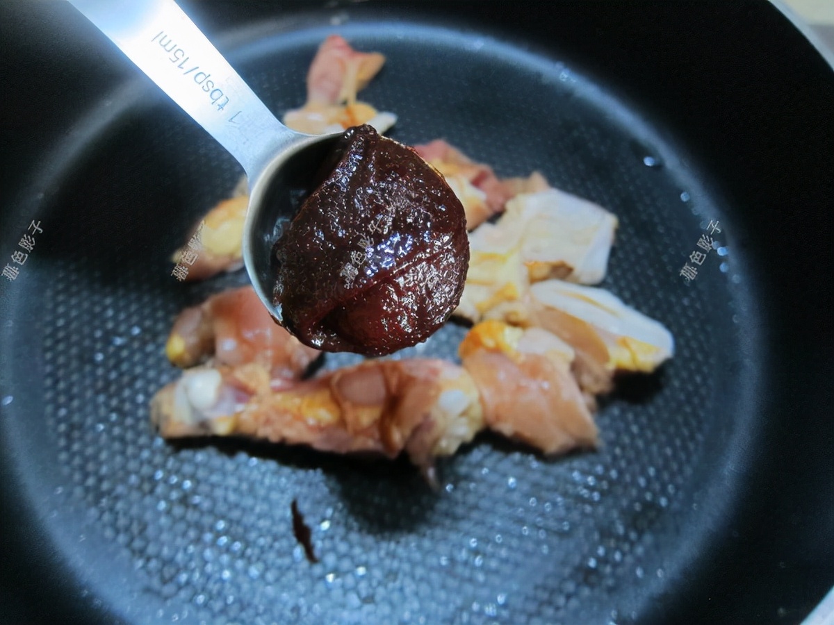 锅内加植物油,然后把鸡块下锅,翻炒到没有血水,加六月香辣椒酱2勺即可。