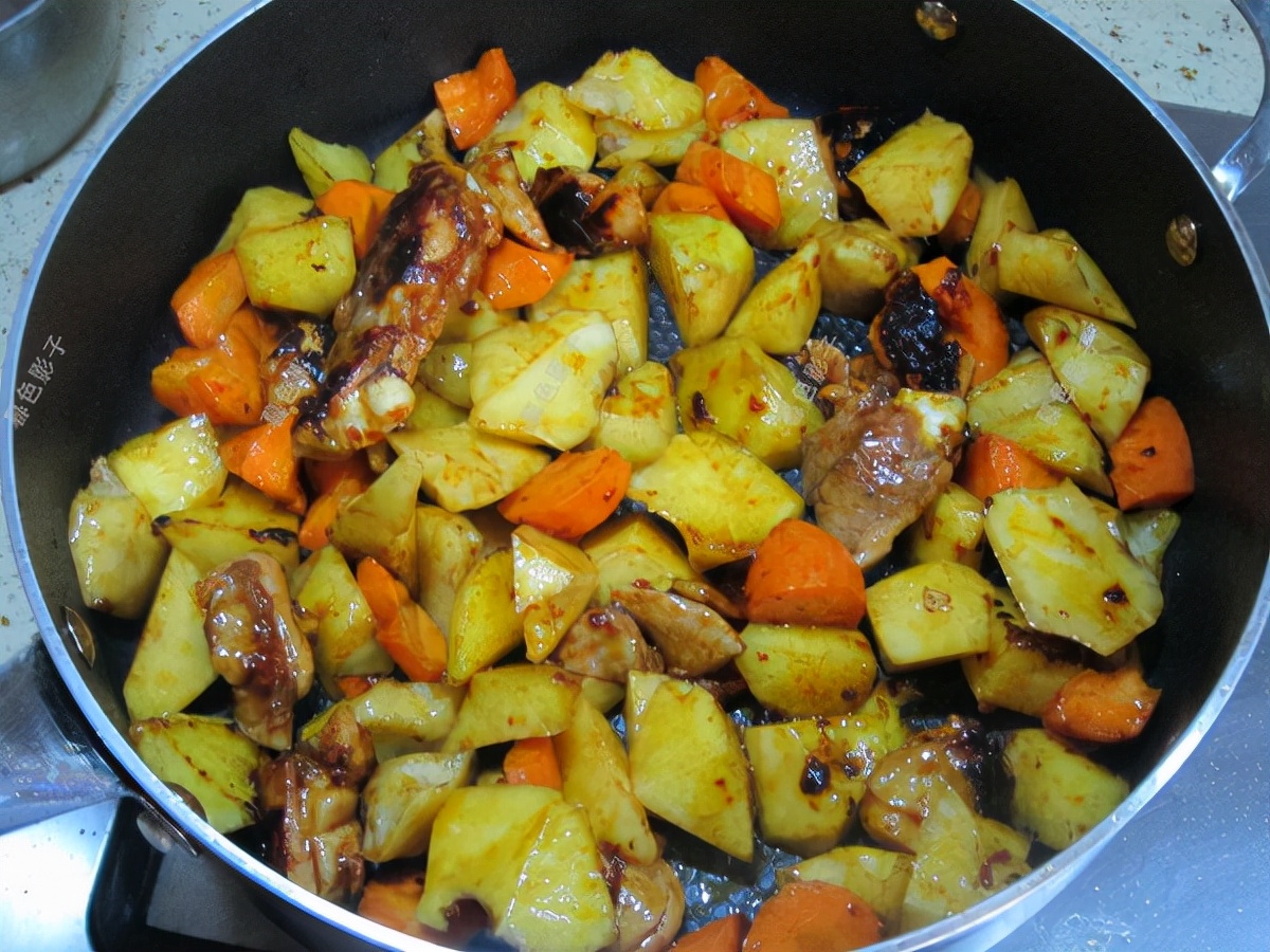炒好的鸡肉块,加土豆和胡萝卜下锅翻炒。